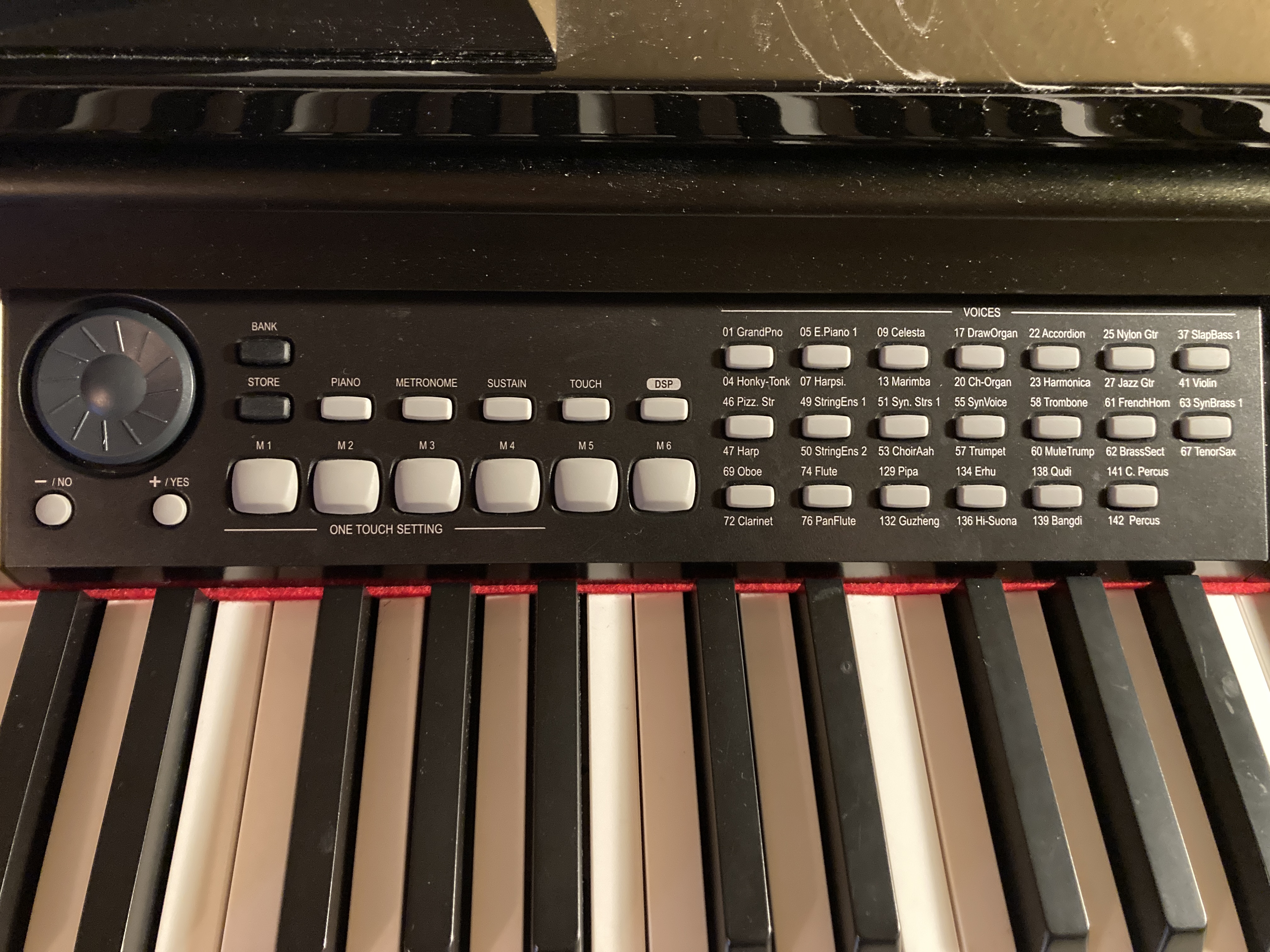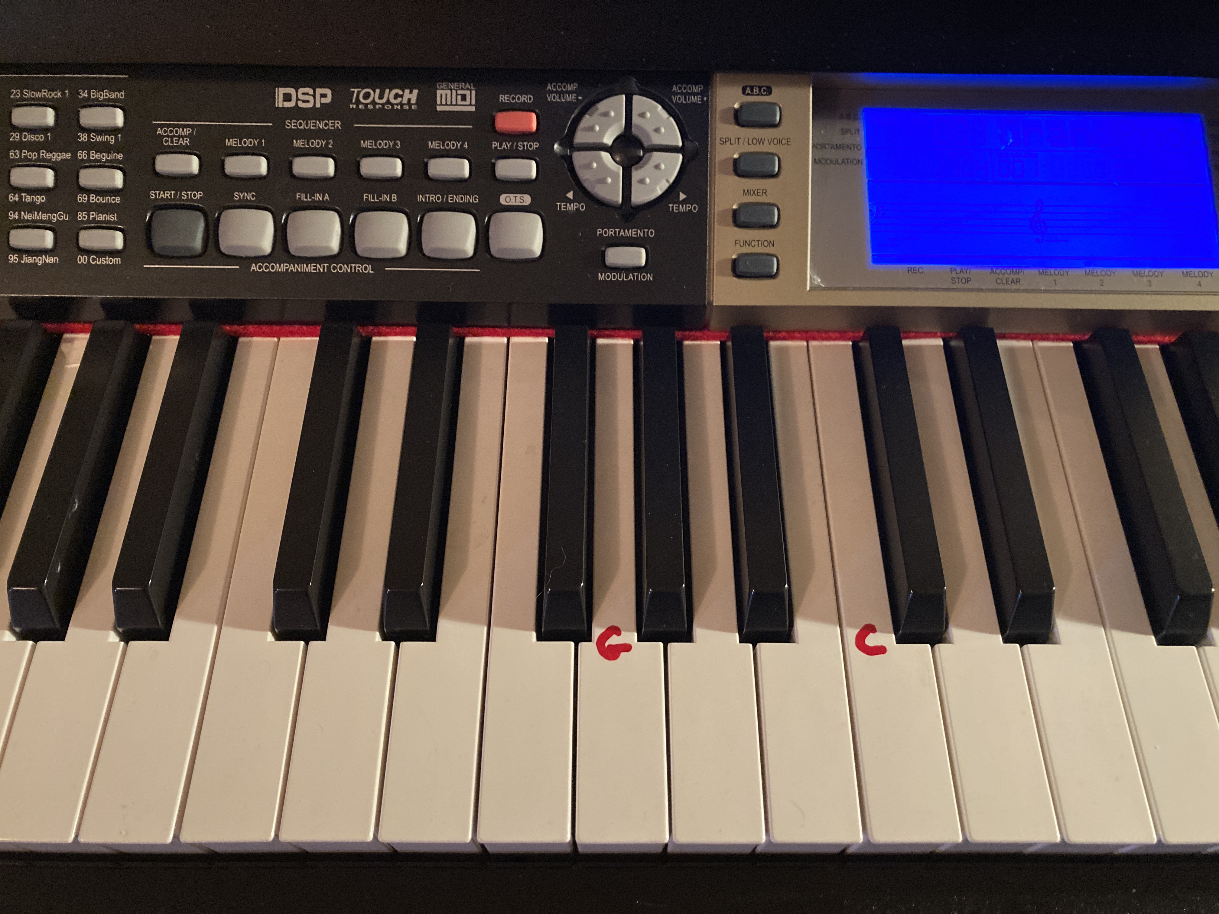 Es hat 3 Fußpedale, Kopfhöhreranschluß, LCD-Display und kann mit Aktiv-Boxen oder einem externen Verstärker verbunden werden.